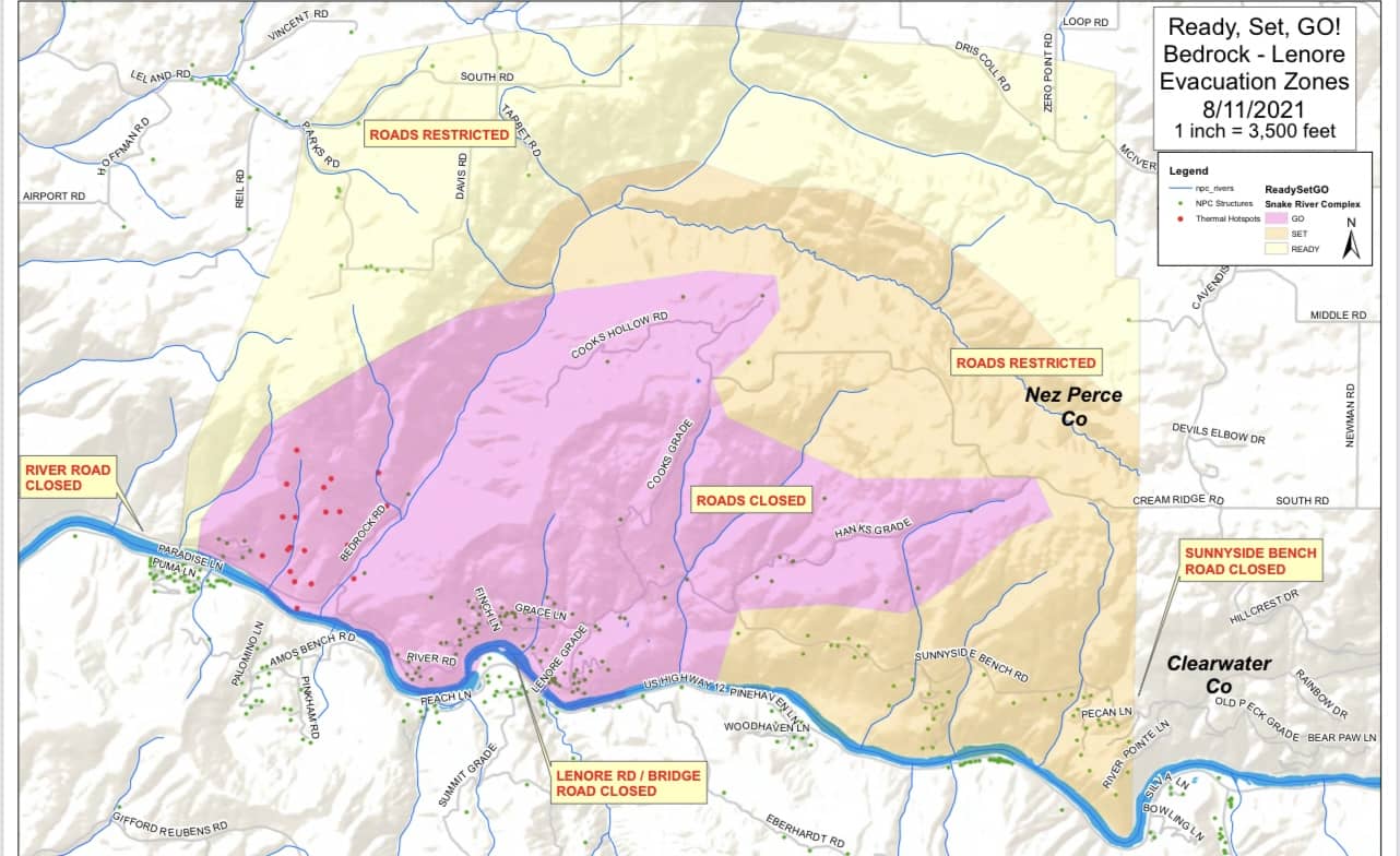 UPDATE, AUG 12: The Bedrock Fire near Lenore kicked back up and changed directions, and evacuations of River Road are beginning again, from the intersection of Bedrock Road to Lenore Grade on River Road, according to Nez Perce County spokesman Nick Woods. (Lewiston Tribune)
