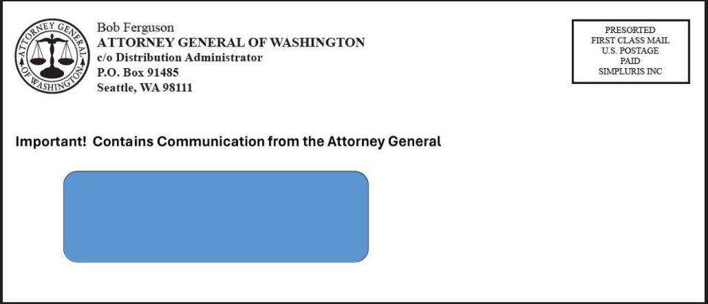 Checks will arrive in envelopes like the sample provided below to let Washingtonians know what the official mailer from the Attorney General’s Office will look like: