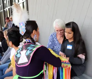 A young lady has the opportunity to hold a piece of regalia from a member of the Nez Perce tribe. This Saturday, children who are blind or visually impaired will once again have the opportunity to spend time with members of the Nez Perce learning about the tribe. (Photo Courtesy of Courageous Kids)