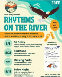 In Kamiah you’ll find Rhythms On The River. The monthly summer festival’s third installment is Friday night from 6 to 8 at Riverfront Park. The talent is country-and-blues band Missing Pieces.