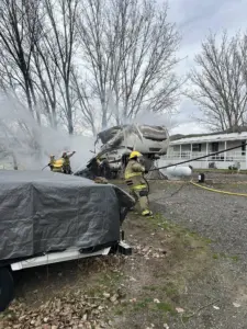 Volunteer Firefighters from Nez Perce County Fire and Lapwai Fire were busy this weekend. On Saturday they both responded to an RV fire at Eaton’s Mobile Home Court between Lewiston and the Clearwater River Casino. Nez Perce County firefighters arrived to find the 5th Wheel ablaze, threatening other structures on two sides. The cause is still under investigation.