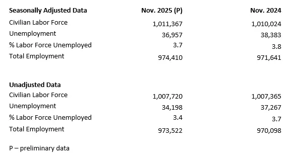November’s labor force was 1,011,367 while the labor force participation rate – the percentage of people 16 years or older who are either employed or looking for work – was at 62.9%. Total employment was 974,410 and unemployment was 36,957.
