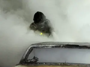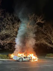 Asotin County Deputies found a car burning this morning. It happened at Swallows Nest Boat Launch, just south of Clarkston. The fire traveled to nearby bushes and a tree. Asotin County Fire District firefighters responded and found the car fully engulfed in flames. They had to cut open the hood to get to the fire in the engine compartment. We can not confirm the two are connected, but when I arrived, there was a gas can on the ground about 10 yards from the car.