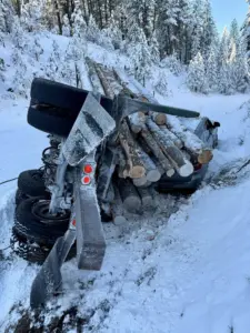 A trailer full of logs rolled on top of a Valley County patrol vehicle with deputies inside. Yesterday (Thurs) morning deputies were east of Cascade on Warm Lake Road for report of a tree that had fallen across the road. They were blocking the southbound traffic while the road department worked to remove the tree.