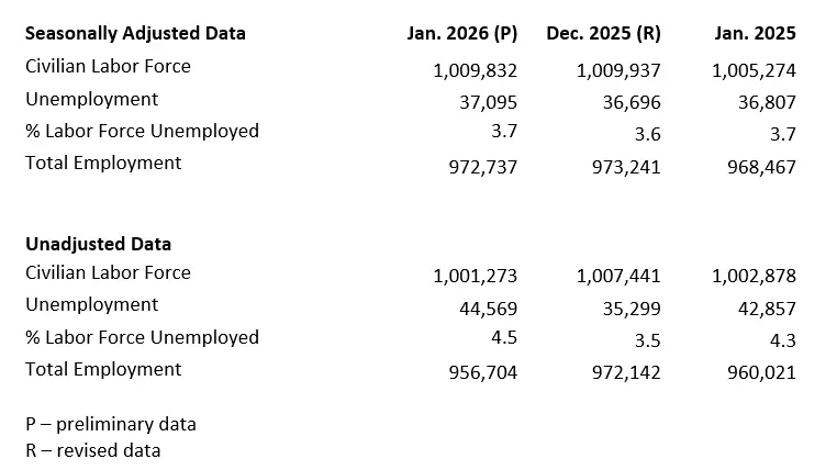 December’s labor force decreased by 105 people to 1,009,832 while the labor force participation rate – the percentage of people 16 years or older who are either employed or looking for work – decreased by 0.1 percentage point between December and January, down to 62.8%.