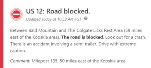 ALERT: US 12 near milepost 135 is blocked due to a collision involving a semi. The Idaho State Police is on the scene.